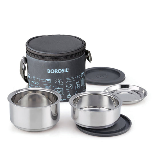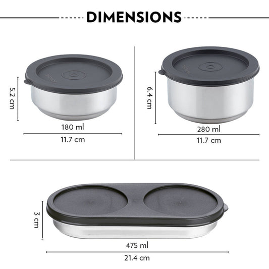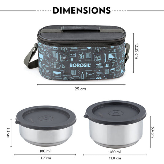 Borosil Carryfresh Insulated SS Lunchbox, Set of 3, (280ml x 2) + 180ml