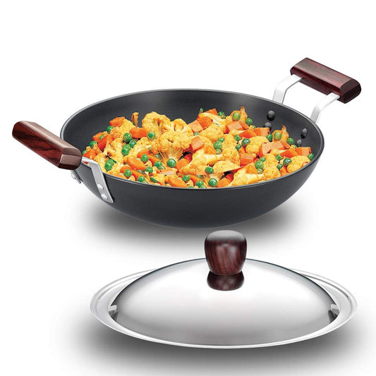 Futura Hard Anodised Deep Fry Pan Wok (Round Bottom) with Stainless Steel Lid by Hawkins