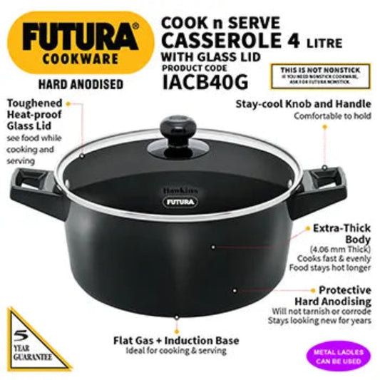 Futura By Hawkins Induction Compatible Cook n Serve Casserole 4 Litre with Glass lid