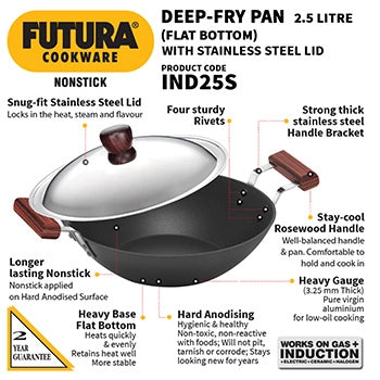 Futura By Hawkins Induction Compatible Nonstick Deep Fry Pan 2.5 Litre with Stainless Steel Lid (Flat Bottom, 3.25 mm Thick)