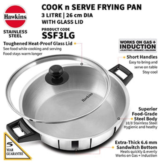 Hawkins Induction Compatible Stainless Steel Cook n Serve Frying Pan 3 Litre with Glass Lid (SSF3LG)