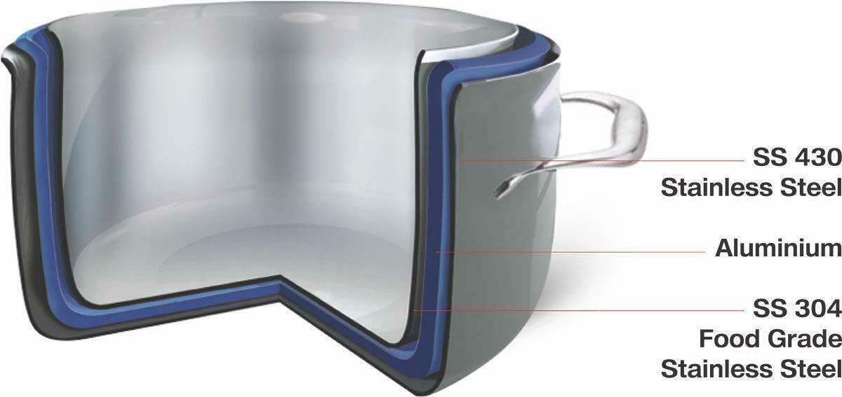 LAYER 1- Food Grade 18/8 stainless steel used in the inner surface for healthy cooking. 18/8 stainless steel is the most superior stainless steel which is rust free